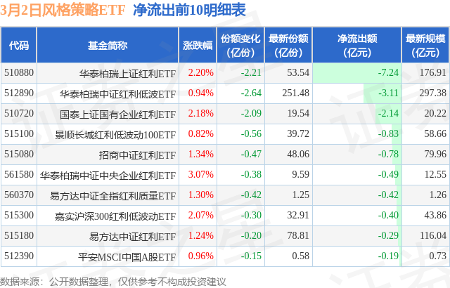 当日有28只风格策略ETF基金出现资金净流出,其中净流出排首位的是华泰柏瑞上证红利ETF(510880),份额减少了2.21亿份,净流出额为7.24亿元。