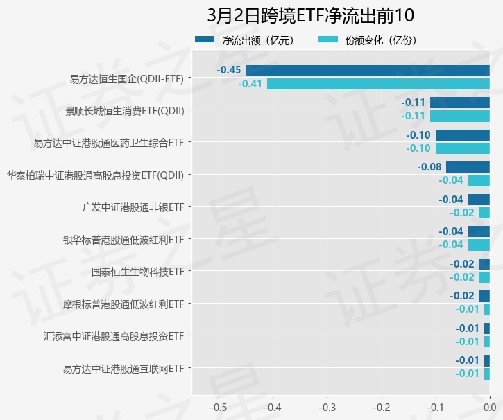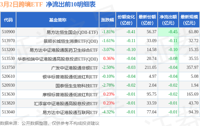 当日有13只跨境ETF基金出现资金净流出,其中净流出排首位的是易方达恒生国企(QDII-ETF)(510900),份额减少了4100.0万份,净流出额为4453.26万元。