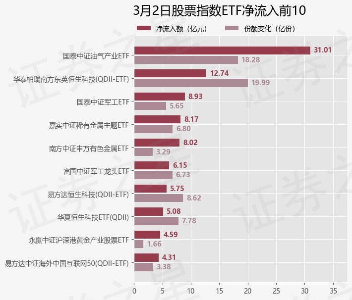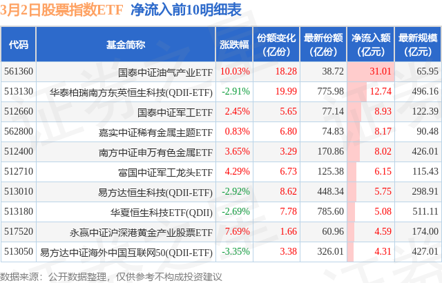 当日有182只股票指数ETF基金出现资金净流入,其中净流入排首位的是国泰中证油气产业ETF(561360),份额增加了18.28亿份,净流入额为31.01亿元。