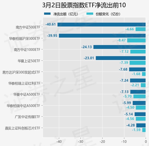 当日有279只股票指数ETF基金出现资金净流出,其中净流出排首位的是南方中证500ETF(510500),份额减少了4.66亿份,净流出额为40.61亿元。