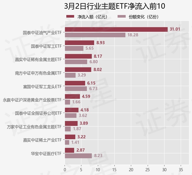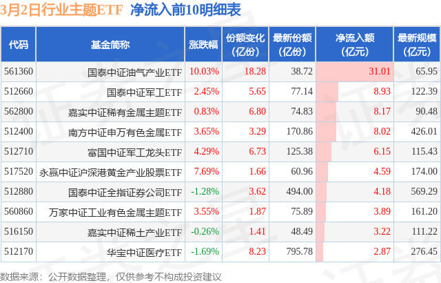 当日有116只行业主题ETF基金出现资金净流入,其中净流入排首位的是国泰中证油气产业ETF(561360),份额增加了18.28亿份,净流入额为31.01亿元。