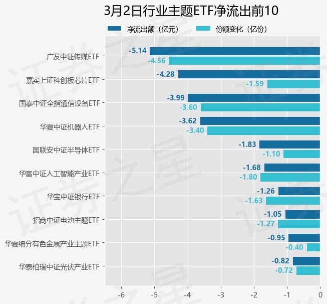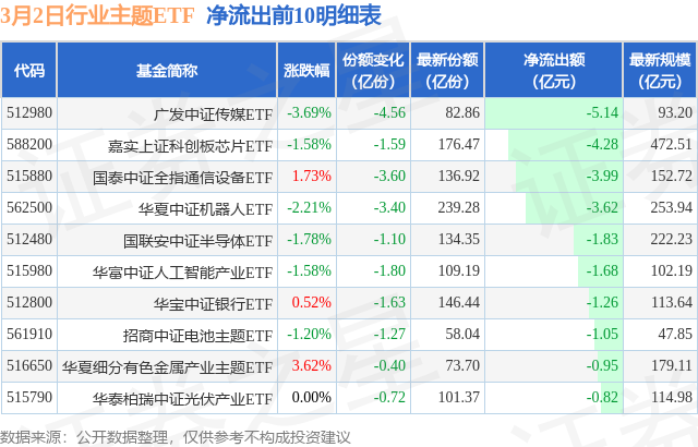当日有152只行业主题ETF基金出现资金净流出,其中净流出排首位的是广发中证传媒ETF(512980),份额减少了4.56亿份,净流出额为5.14亿元。
