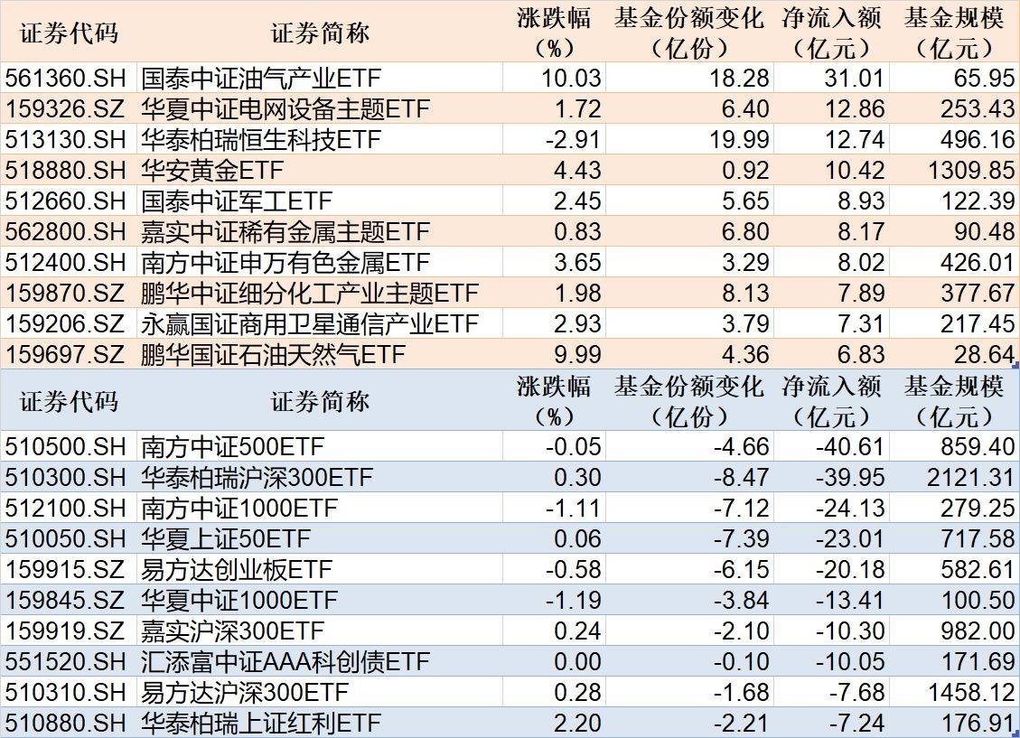 Wind数据显示,在3月2日的非货币ETF市场中,国泰中证油气产业ETF基金份额增加18.28亿份,净流入额31.01亿元;华夏中证电网设备主题ETF基金份额增加6.40亿份,净流入额12.86亿元;华泰柏瑞恒生科技ETF基金份额增加19.99亿份,净流入额12.74亿元。