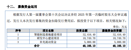 锐翔智能此次IPO欲募集48166.1万元,分别用于智能制造基地建设项目、研发中心建设项目、补充流动资金,具体情况如下:
