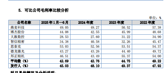 笔者注意到,公司业务具备较强的盈利能力,报告期内毛利率分别为47.92%、49.37%、48.1%、45.08%,而同行可比公司平均值分别为49.22%、44.75%、42.76%、42.69%,自2023年起,锐翔智能毛利率已反超并持续高于行业平均水平。