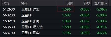 卫星概念股走低,国博电子跌超9%,臻镭科技、北斗星通跌超7%,航天电子、中国卫通跌超5%。
