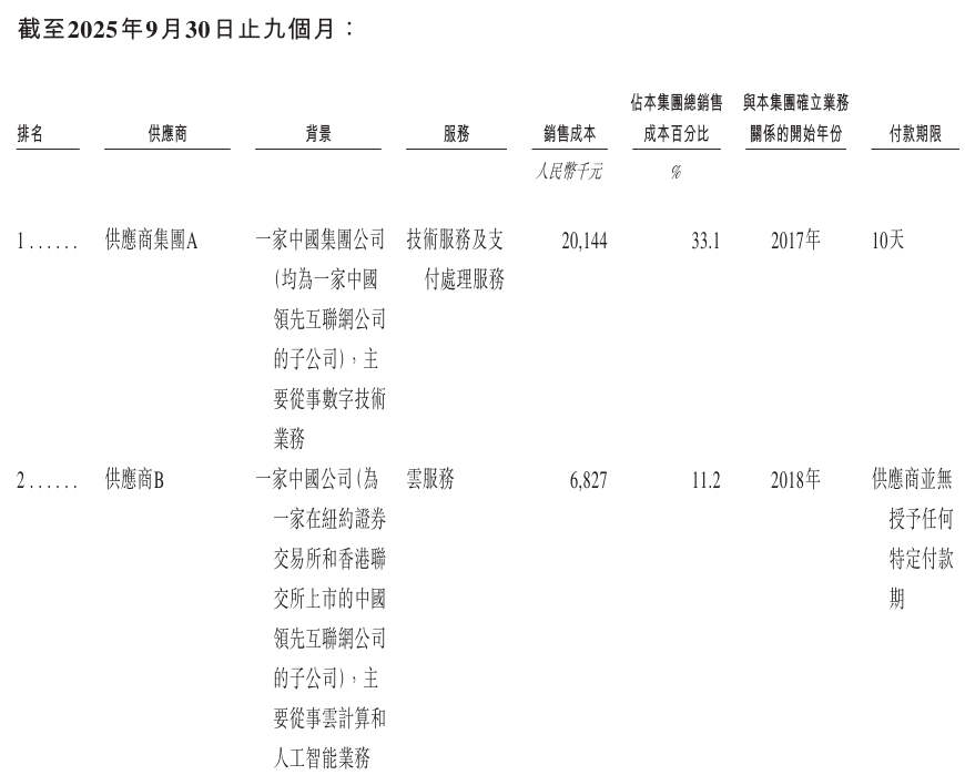招股书披露,其最大的服务供应商(供应商集团A)是一家中国领先互联网公司的子公司,主要提供技术服务及支付处理服务;(供应商B)为一家在纽约证券交易所交易所和香港联在中国证券交易所上市的领先互联网公司(的子公司),主要从事云计算和人工智能业务。