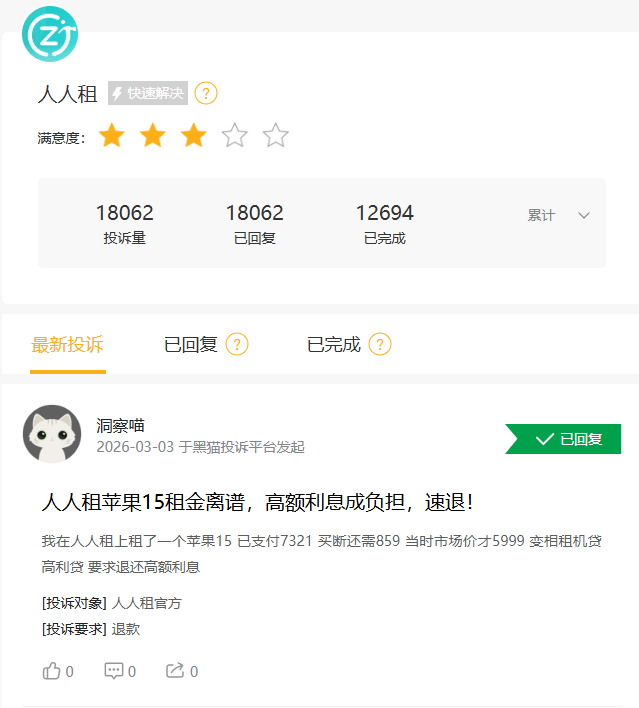 如仅黑猫投诉平台,人人租的累计投诉量就高达18000条。最新针对人人租的投诉显示,客户在人人租上租了一个苹果15,已支付7321,买断还需859,当时市场价才5999 ,变相租机贷、高利贷。