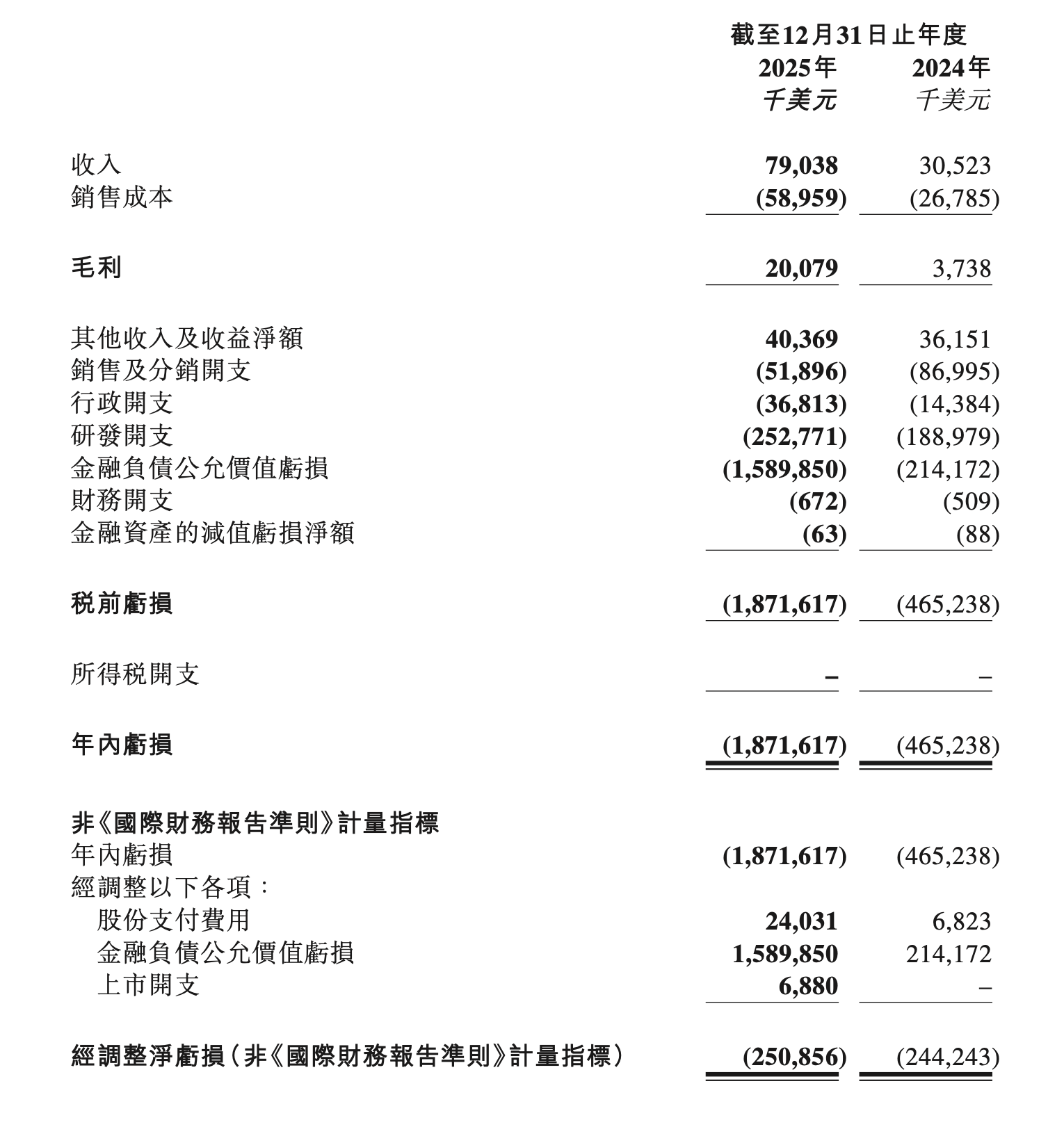 需要注意的是,MiniMax亏损大幅增加,主要由于其估值持续增加,致使优先股录得重大重新计量亏损。财报显示,其金融负债公允价值亏损由2024年的2.142亿美元增加至2025年的15.899亿美元。