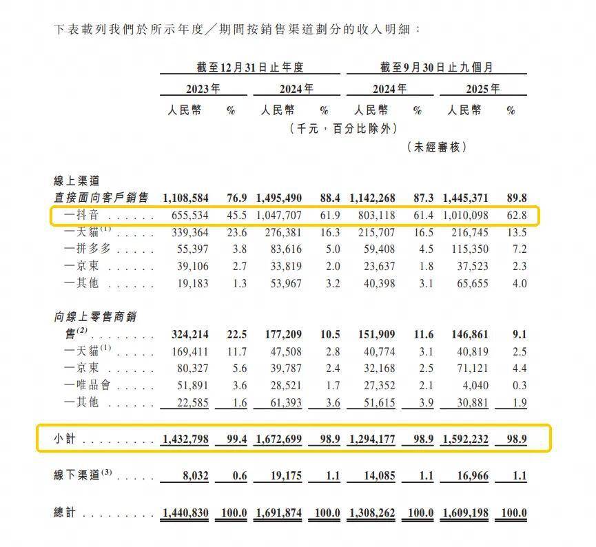 据西子健康招股书披露,2023 年至 2024 年及 2025 年前 9 个月,公司线上渠道实现收入分别为约 14.33 亿元、16.73 亿元及 15.92 亿元,分别占比 99.4%、98.9% 及 98.9%。