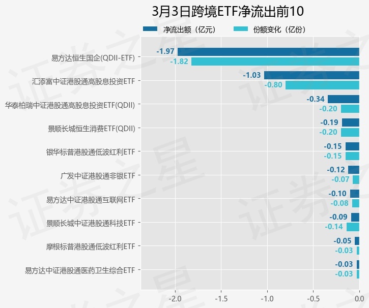 当日有18只跨境ETF基金出现资金净流出,其中净流出排首位的是易方达恒生国企(QDII-ETF)(510900),份额减少了1.82亿份,净流出额为1.97亿元。