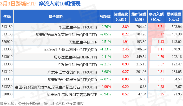 当日有45只跨境ETF基金出现资金净流入,其中净流入排首位的是华夏恒生科技ETF(QDII)(513180),份额增加了8.89亿份,净流入额为5.71亿元。