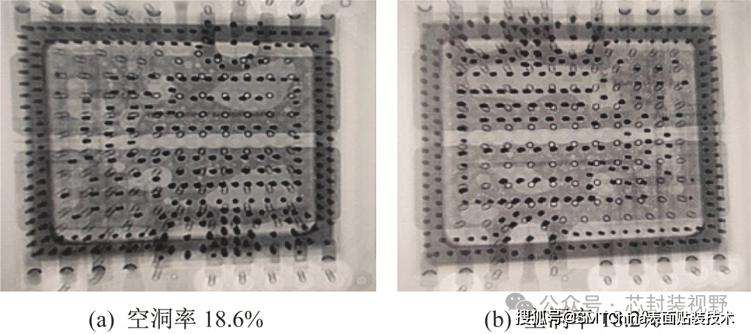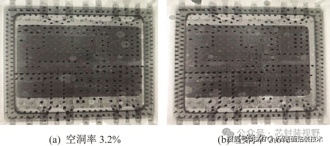 造成BTC器件空洞较大的主要原因为器件离板高度较低、焊盘面积较大,导致焊膏挥发中气体无法被排出。在焊接过程中,焊膏中的易挥发成分受热会挥发成气体,同时焊膏中的有机酸去除焊接层表面氧化物时也会产生气体,这些气体部分会挥发而脱离锡膏,部分气体受熔融焊锡料的表面张力影响无法顺利排出,形成气泡,气泡在焊料凝固后成为焊料层中的空洞。该器件热沉焊盘面积较大,焊膏用量较多,溶剂小分子等挥发性物质较多,且焊盘面积大,挥发路径长,焊膏中挥发的气体难以排出。因此,热沉焊盘更容易产生较大的空洞。