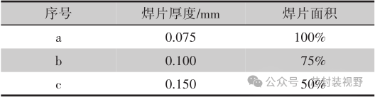 BTC器件热沉焊盘采用焊片焊接,引脚处采用焊膏。印刷锡膏后,在 BTC 器件热沉焊盘上放置预成型焊片,焊片涂覆助焊剂,如图 4 所示。对焊片与焊膏结合焊接 BTC 器件开展实验研究,选择 0.150 mm 厚度的钢网,焊片选择0.075 mm、0.100 mm、0.150 mm 厚的涂覆型焊片 (助 焊 剂 含 量 0.2%)。 焊 膏 中 合 金 成 分 约50%,以热沉焊盘焊片与引脚焊盘焊膏合金含量一致为原则,确定不同厚度焊片的面积 (保证焊后高度一致),共设置3组试验。参数见表1。
