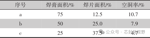 预热保温阶段,焊片支撑器件,使焊膏中的挥发物质排出,部分助焊剂流向焊片区域,有利于降低空洞率;焊料熔化阶段,焊片熔化从中间向四周扩展,焊锡与焊接面的吸附力促进气泡向外移动,气泡移动至焊膏区域与熔融焊锡汇合时,焊锡表面张力阻止气泡排出,在焊片与焊膏的交界处出现较大的空洞。此外,随着焊膏面积的减少导致助焊剂量减少,进一步降低空洞率。采用37.5%面积的0.150 mm焊片与25%面积焊膏组合时效果最佳。