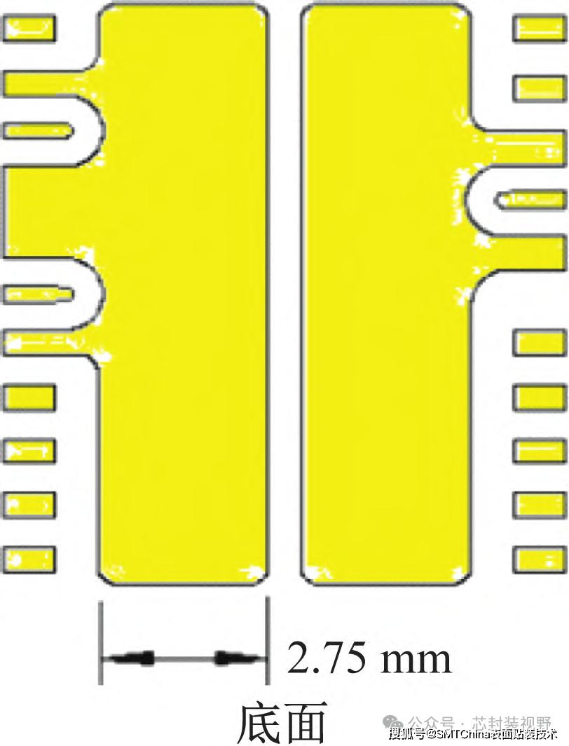 某Ku频段微波器件为BTC器件A,外形尺寸如图1所示,焊盘尺寸如图2所示,焊接部位包括底面两侧引脚焊盘和热沉焊盘,焊盘为镀金,热沉焊盘分为2个部分,面积约为50 mm 2 。该器件完成焊膏印刷、表面贴装后,采用 Sn63Pb37 焊膏,0.15 mm厚表贴钢网,通过12温区热风回流焊炉进行焊接,焊后采用X射线检测设备进行检测,如图3所示。BTC器件底部大面积焊盘空洞率较高,整体空洞约为20%,单个空洞尺寸约占焊盘面积的6~10%。该器件采用系统级封装技术,内部由多个器件构成有源电路,焊料层空洞的影响会被放大,影响整体传输性能。该器件工作频率为12~18 GHz,对热沉焊盘的焊接要求较高,需确保焊接空洞率在10%以下,单个最大空洞小于3%。
