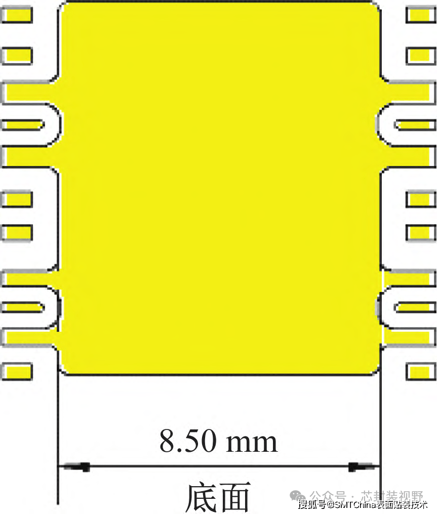 BTC器件采用焊膏焊接时,热沉焊盘面积较大导致空洞率较高,常规处理措施包括焊盘工艺性设计、钢网模板设计、焊接温度曲线设计等,通过增加回流焊过程中焊膏挥发性物质的排出通道以降低空洞率。但上述措施对小面积热沉焊盘的效果较好,对大面积焊盘的效果有限。除常用的焊膏外,还可采用焊片焊接。焊片是纯金属片状焊料,可调整形状、厚度等参数,焊片可涂覆助焊剂。PCB上除BTC外,还有大量的电阻、电容、方型扁平式封装 (quad flat package,QFP)、小外形封装 (small out-line package,SOP) 等元器件,引脚较小。因此,在大面积热沉焊盘处采用焊片进行焊接,其余位置仍使用焊膏。
