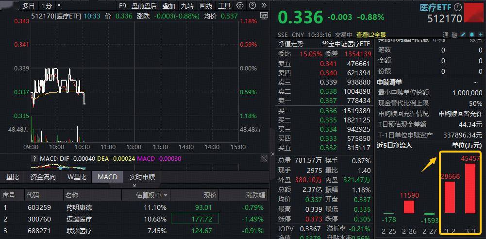ETF盘中资讯|资金加速“抄底... 3月4日早盘,大市延续调整,A股医药水下震荡,跌势较前一日有所收敛。 医疗个股涨跌分化,迈瑞医疗跌逾...