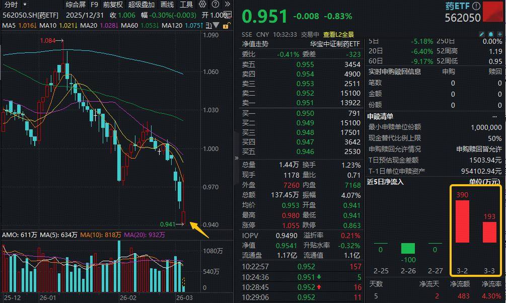 制药板块个股跌多涨少,权重股恒瑞医药、新和成、百济神州纷纷下跌,创新药概念股艾力斯逆市飙升逾12%一枝独秀。场内唯一跟踪制药指数的药ETF(562050)场内价格续创上市以来新低,此前两日合计获近600万元低吸增仓。