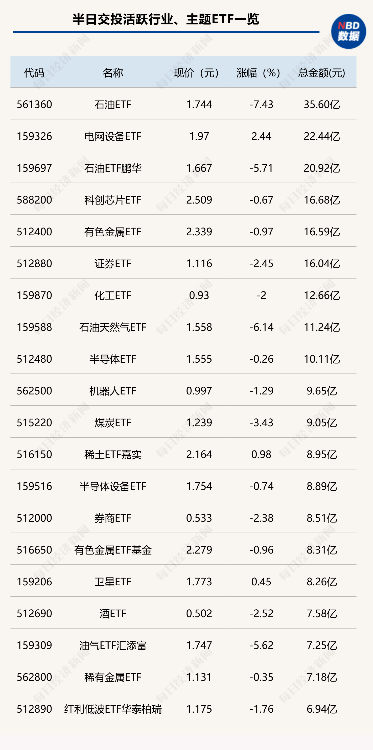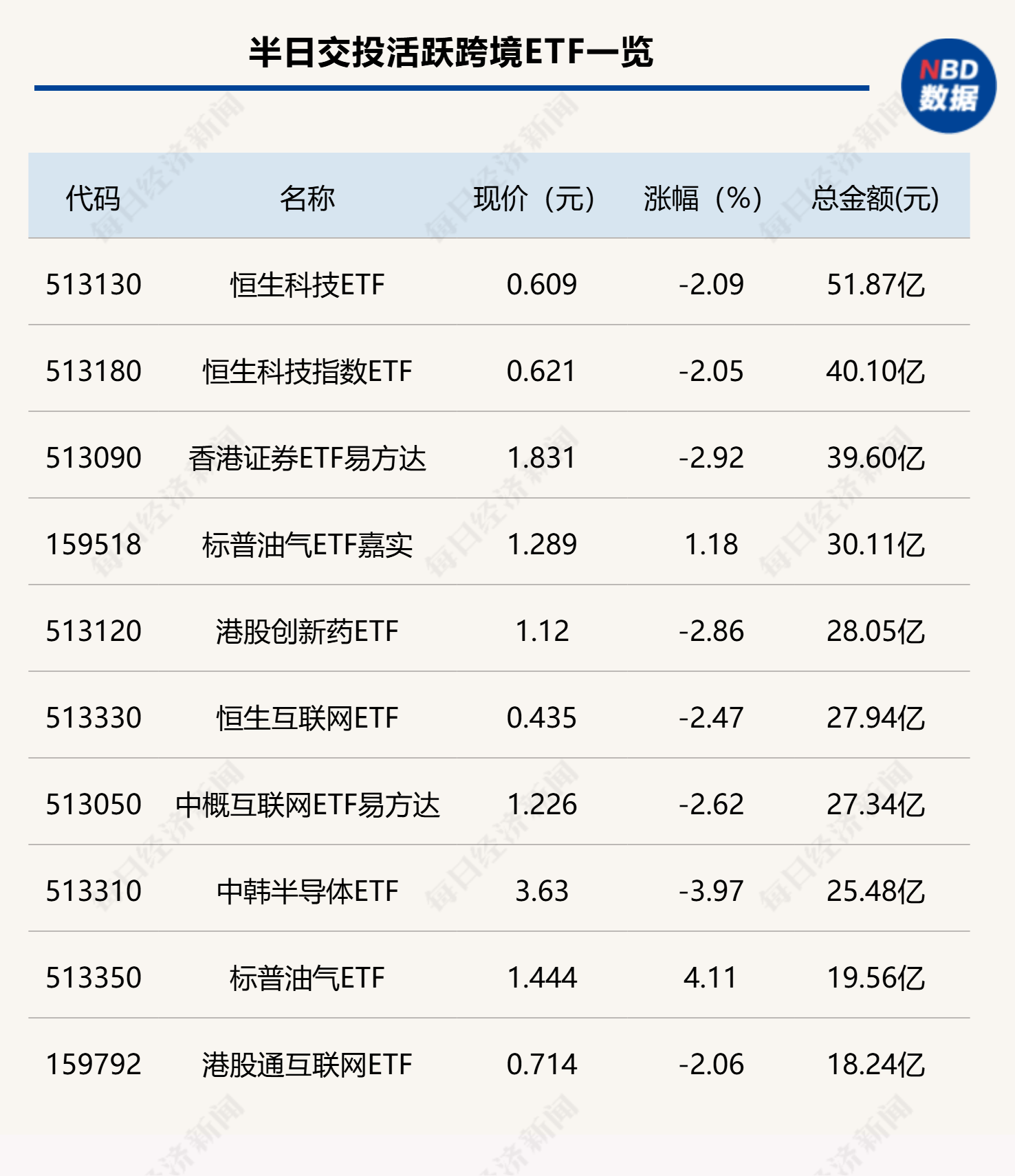 今日上午,石油ETF(561360)成交金额环比略有减少,但成交金额依旧高达35.6亿元,电网设备ETF(159326)和石油ETF鹏华(159697)半日成交金额也超过20亿元。跨境ETF方面,恒生科技ETF(513130)半日成交金额达到51.87亿元,交易量较大。