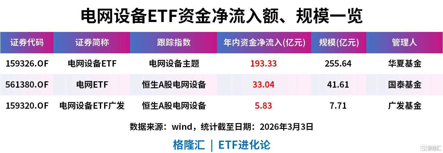 电网设备ETF成为市场关注度最高的赛道之一。今年以来,超230亿元资金净流入相关ETF。其中,电网设备ETF获资金净流入超193亿元,电网ETF、电网设备ETF广发年内资金净流入分别为33.04亿元,5.83亿元。