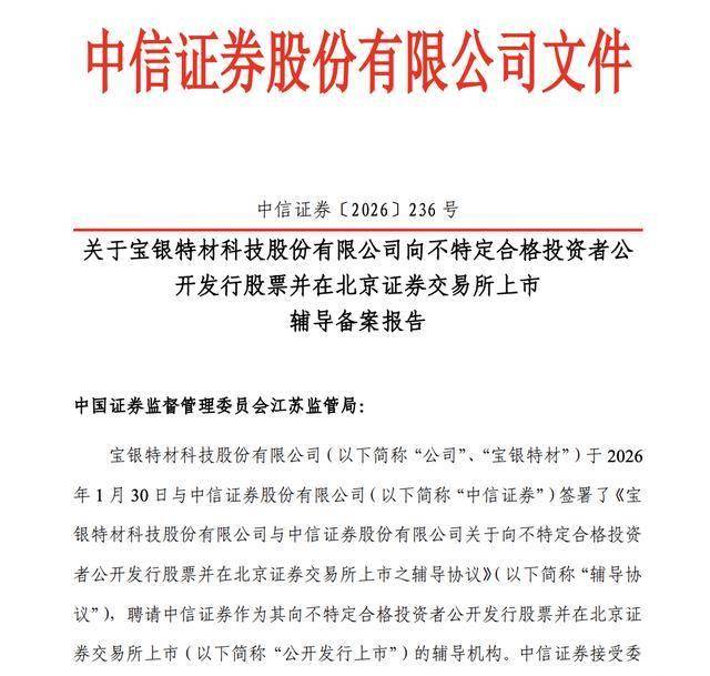 瑞财经 刘治颖 2月5日,宝银特材科技股份有限公司(以下简称:宝银特材)在江苏证监局完成IPO辅导备案,拟北交所上市,辅导机构为中信证券股份有限公司。