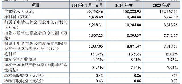 2023年、2024年及2025年上半年,宝银特材营业收入分别为15.26亿元、15.89亿元、9.05亿元,净利润分别为8742.79万元、1.03亿元、5438.49万元,毛利率分别为15.02%、16.56%、15.69%。