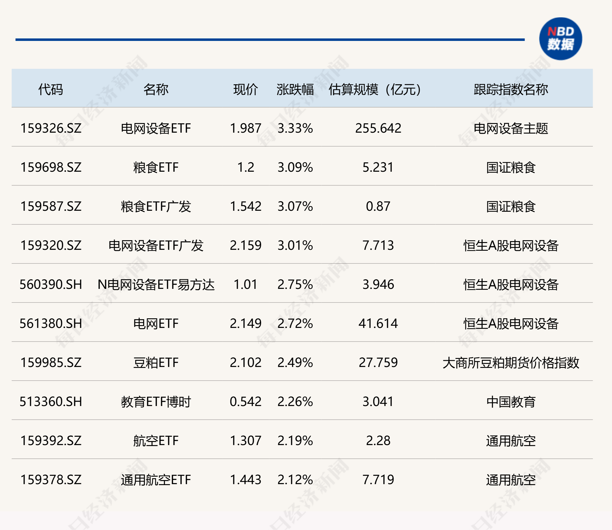 ETF涨跌幅方面,电网设备、粮食相关ETF涨超3%。