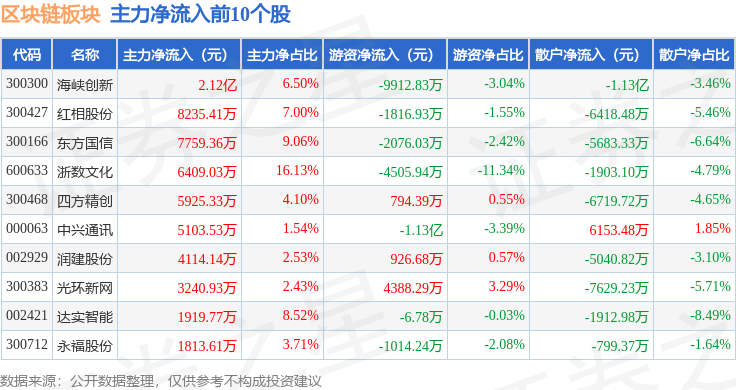 从资金流向上来看,当日区块链板块主力资金净流出51.33亿元,游资资金净流入15.02亿元,散户资金净流入36.3亿元。区块链板块个股资金流向见下表: