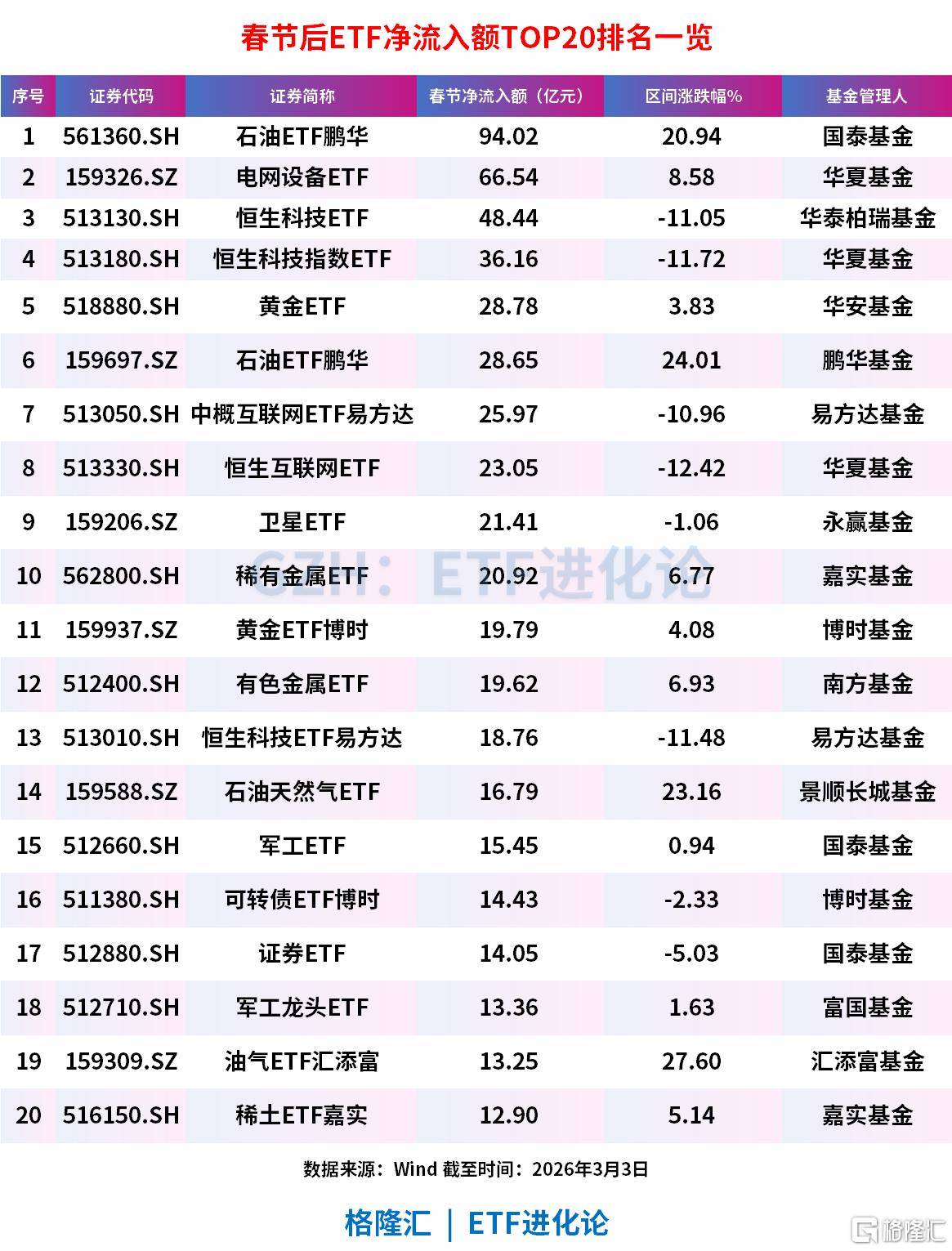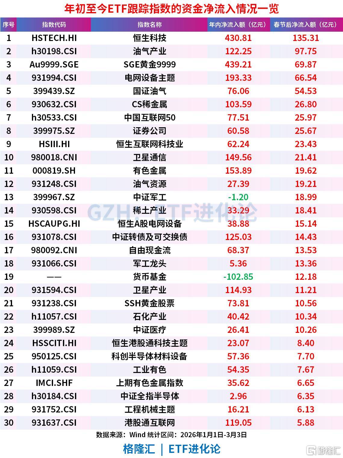 截至3月3日,春节以来,实物资产含量高的ETF指数“吸金”居前,油气产业、SGE黄金9999、电网设备主题、国证油气、CS稀金属、有色金属、油气资源、中证军工、稀土产业、恒生A股电网设备合计净流入406亿元。