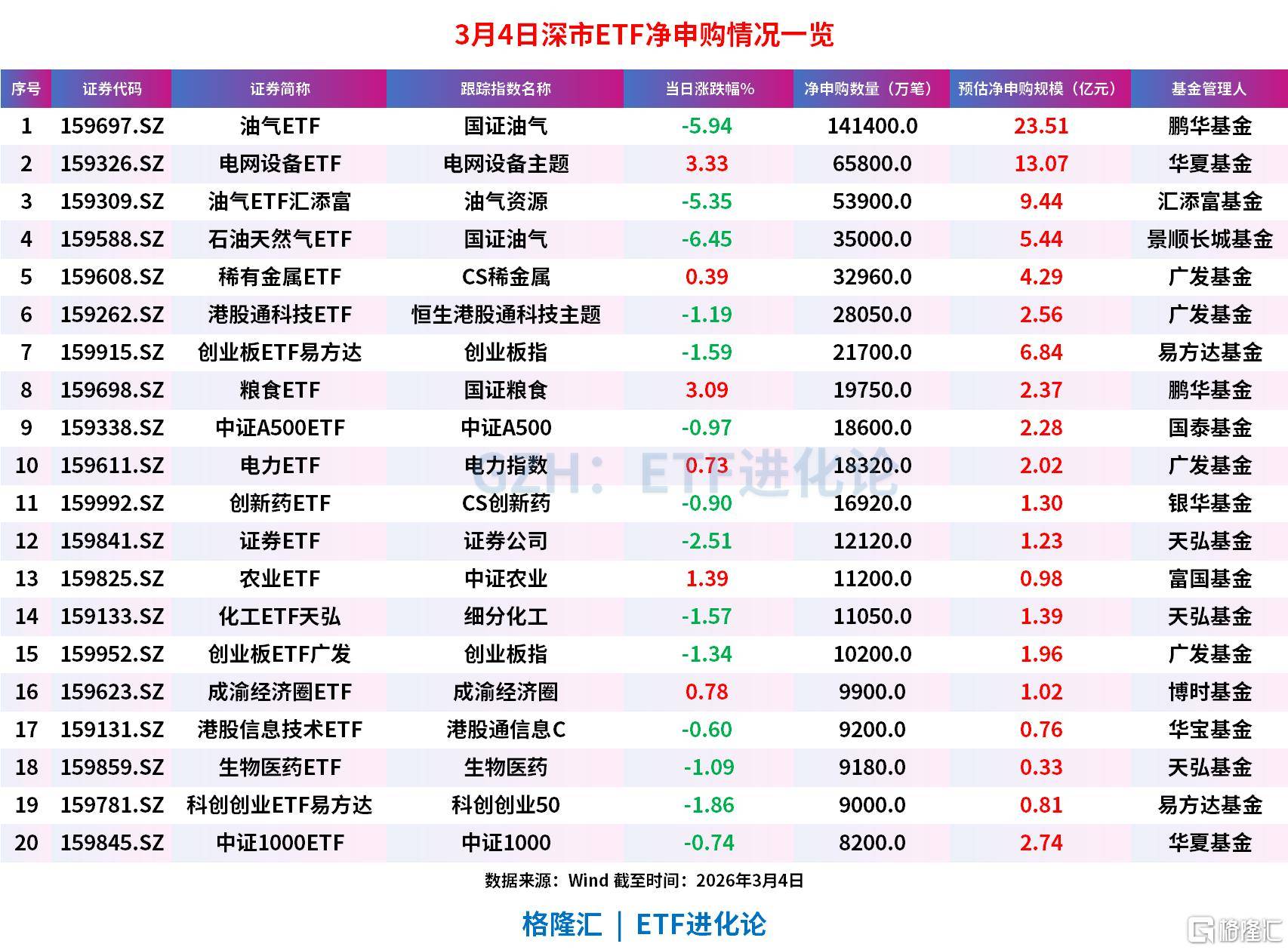 石油ETF鹏华获资金净申购14.14亿份,预估净流入23.51亿元,油气ETF汇添富净申购5.9亿份,净流入9.44亿元,石油天然气ETF净申购3.5亿份,预估净申购5.44亿元。稀有金属ETF净申购3.3亿份,预估净申购4.29亿元。