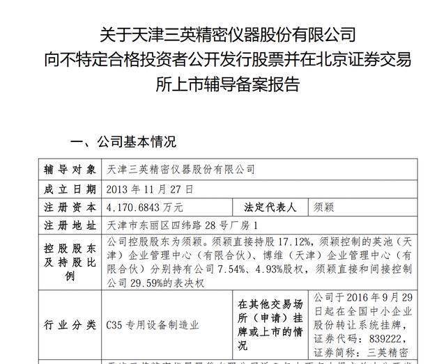 瑞财经 刘治颖近日,天津三英精密仪器股份有限公司(以下简称:三英精密)在天津证监局完成IPO辅导备案,拟北交所上市,辅导机构为华泰联合证券有限责任公司。