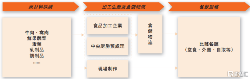 中国比萨餐厅产业链包含原材料采购、加工生产及仓储物流、餐饮服务。