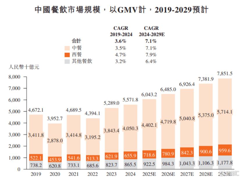 尽管西餐的销售额远不及中餐,但增速快于整体餐饮市场。据灼识咨询资料,2024年中国餐饮市场中的西餐市场规模为6559亿元,预计2029年将达到9596亿元,2024年至2029年的复合年增长率为7.9%。