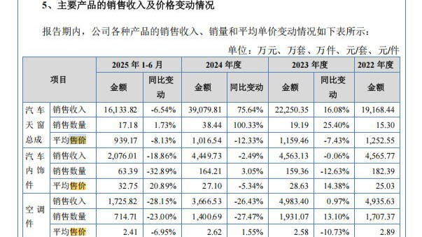 潘建新和天运股份能如愿吗?如今,天运股份的业务结构已发生根本性倾斜。曾经起家的废旧纺织品循环利用业务日渐式微,汽车天窗成为绝对主力:报告期内主营收入占比从2022年的66.15%提升至2025年上半年末的约80%。这种转型本无可厚非,但问题在于,增长的代价是与奇瑞汽车的深度绑定。