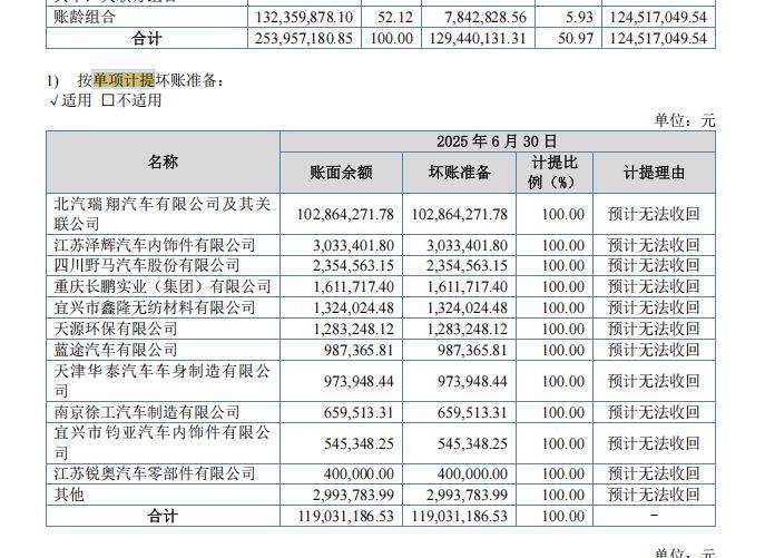 在这背后,是一笔笔艰难的回款。截至2025年上半年末,公司单项计提坏账合计仍达1.19亿元。这些资金主要“套牢”在那些已经破产或陷入经营困境的客户身上,如北汽瑞翔汽车有限公司(前身为北汽银翔)等。
