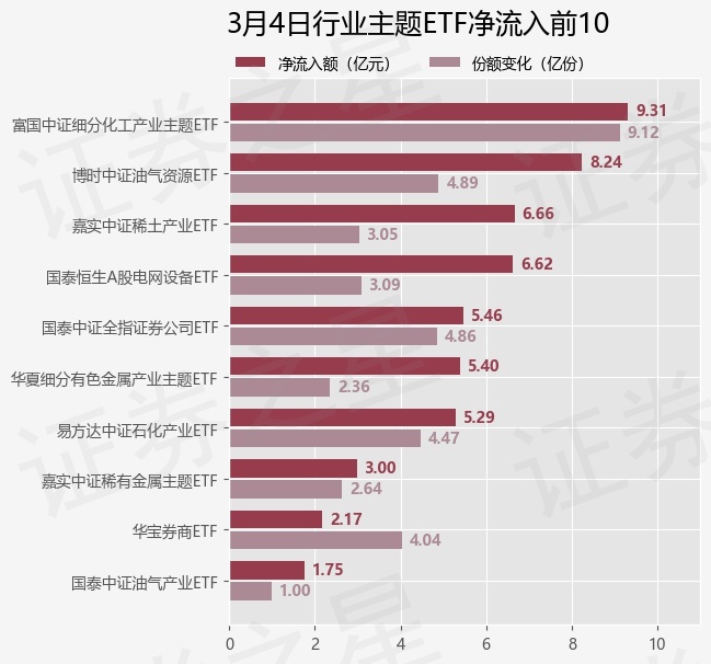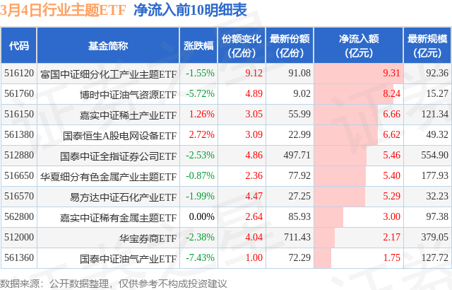 当日有125只行业主题ETF基金出现资金净流入,其中净流入排首位的是富国中证细分化工产业主题ETF(516120),份额增加了9.12亿份,净流入额为9.31亿元。