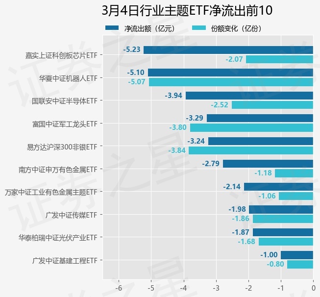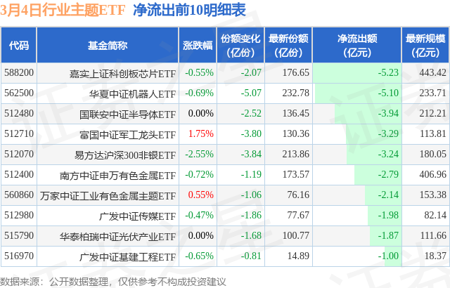 当日有125只行业主题ETF基金出现资金净流出,其中净流出排首位的是嘉实上证科创板芯片ETF(588200),份额减少了2.07亿份,净流出额为5.23亿元。