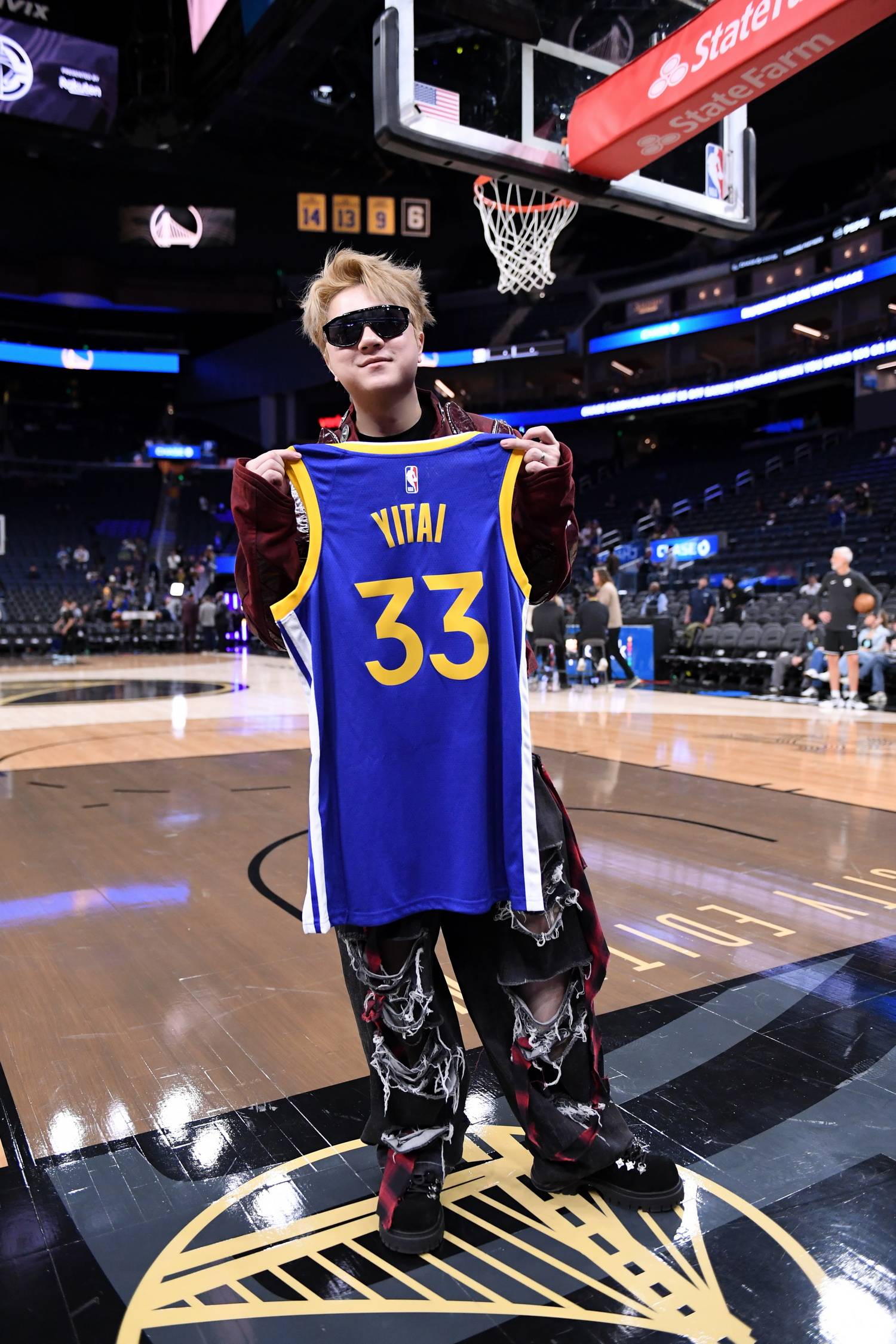 王以太受邀到访金州勇士主场大通中心,近距离感受NBA赛事的火热氛围。在现场,他获赠了一件专属定制的联动球衣。这件球衣不仅保留了金州勇士的经典队标与配色,更巧妙融入了中文说唱元素——球衣背面印着的“以太”二字格外醒目,将王以太的个人音乐标识与美式篮球文化完美融合。