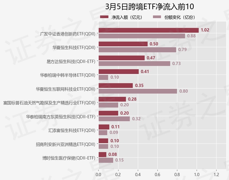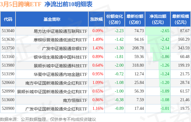 当日有52只跨境ETF基金出现资金净流出,其中净流出排首位的是易方达中证港股通互联网ETF(513040),份额减少了2.23亿份,净流出额为2.65亿元。