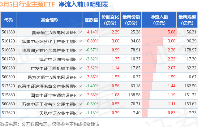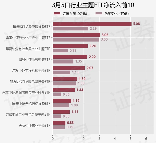 当日有90只行业主题ETF基金出现资金净流入,其中净流入排首位的是国泰恒生A股电网设备ETF(561380),份额增加了2.29亿份,净流入额为5.08亿元。