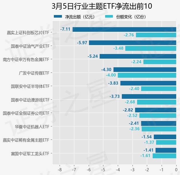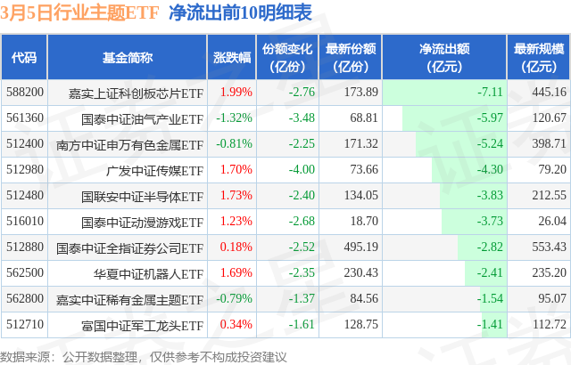 当日有177只行业主题ETF基金出现资金净流出,其中净流出排首位的是嘉实上证科创板芯片ETF(588200),份额减少了2.76亿份,净流出额为7.11亿元。
