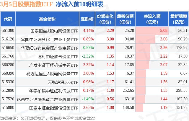 当日有147只股票指数ETF基金出现资金净流入,其中净流入排首位的是国泰恒生A股电网设备ETF(561380),份额增加了2.29亿份,净流入额为5.08亿元。