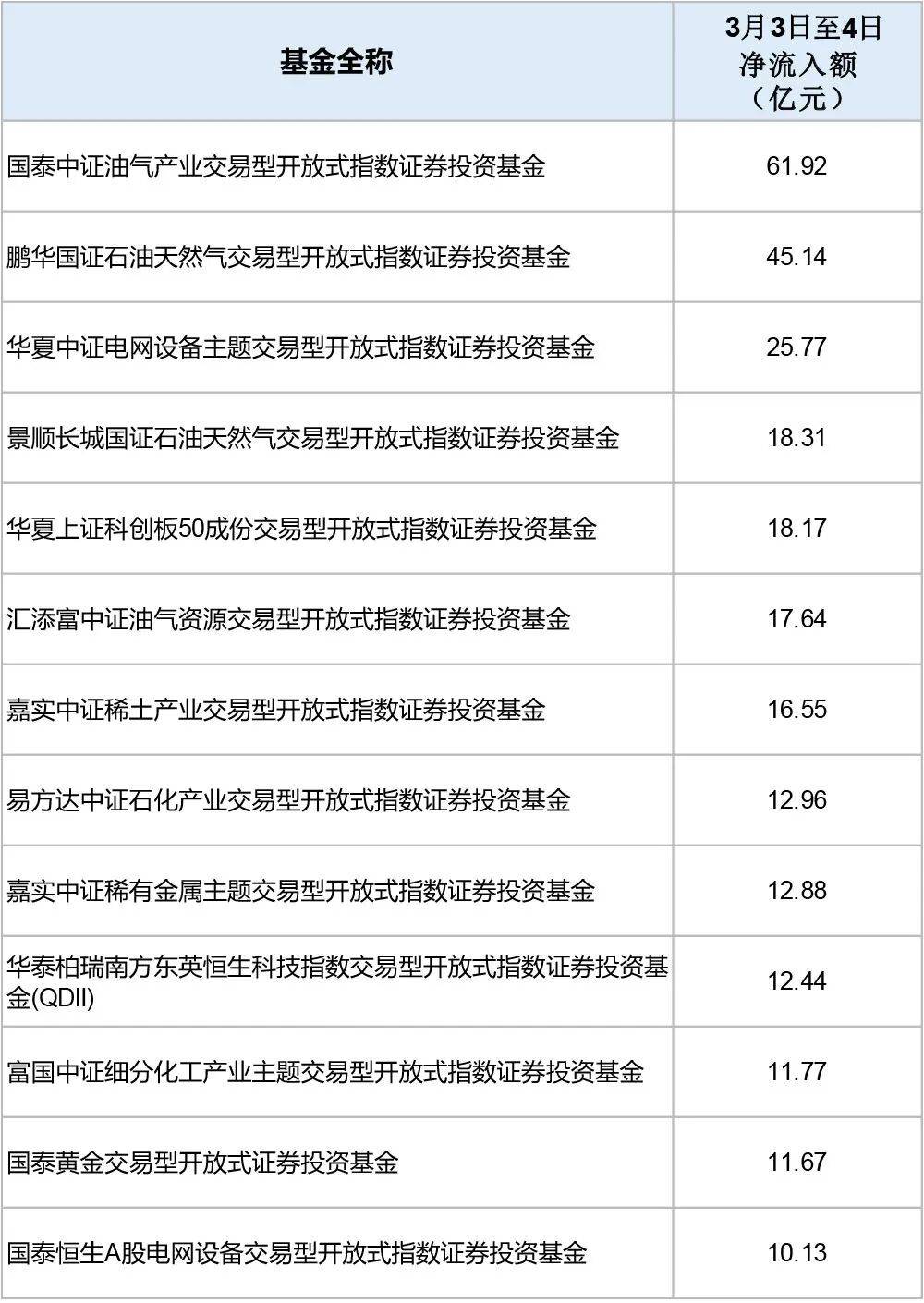 从3月3日至4日资金流向看,行业主题ETF强势“吸金”。其中,油气主题ETF热度较高,国泰石油ETF净流入61.92亿元,鹏华石油ETF净流入45.14亿元,景顺长城石油天然气ETF、汇添富油气ETF净流入也均超17亿元。