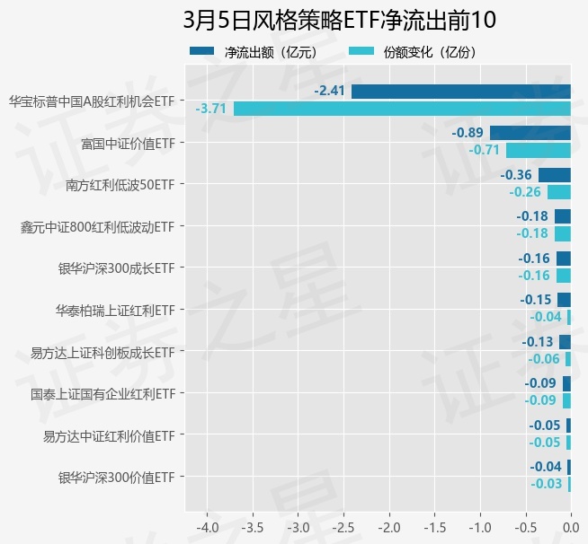 当日有18只风格策略ETF基金出现资金净流出,其中净流出排首位的是华宝标普中国A股红利机会ETF(562060),份额减少了3.71亿份,净流出额为2.41亿元。
