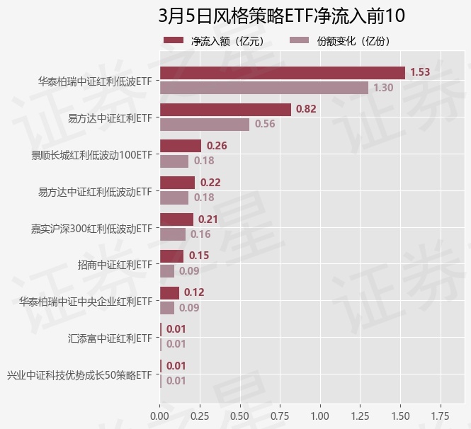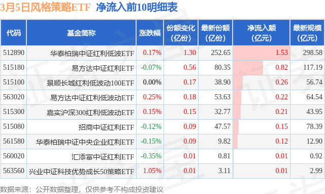 当日有9只风格策略ETF基金出现资金净流入,其中净流入排首位的是华泰柏瑞中证红利低波ETF(512890),份额增加了1.3亿份,净流入额为1.53亿元。