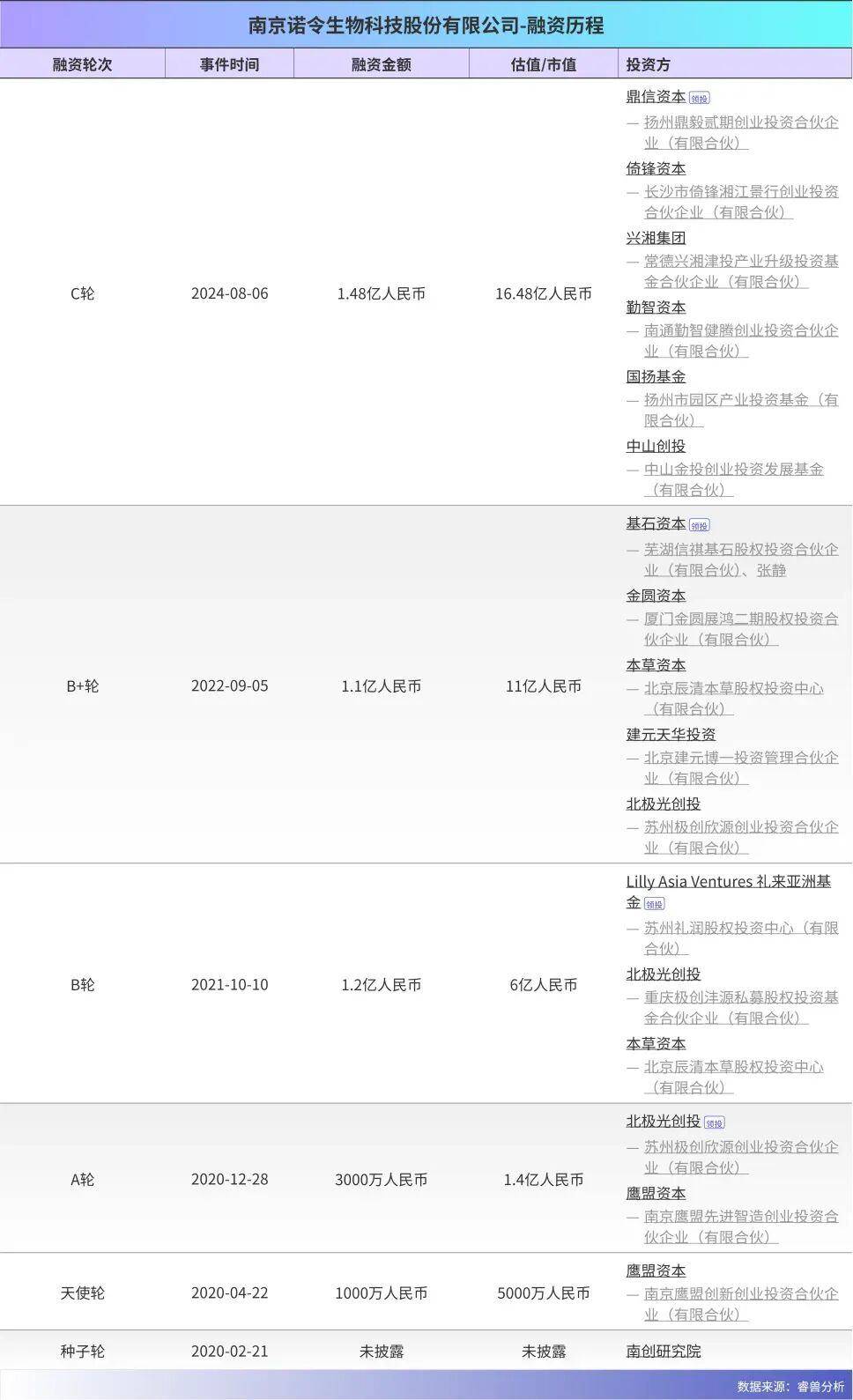 成立后,诺令生物完成了多轮融资,投资方有礼来亚洲基金、北极光创投、鹰盟资本、本草资本、基石资本、南京诺益康、鼎信资本、倚锋创投、扬州园区产业、兴湘资本、金圆资本、建元博一、江北暾智、中山金投、勤智资本等机构。