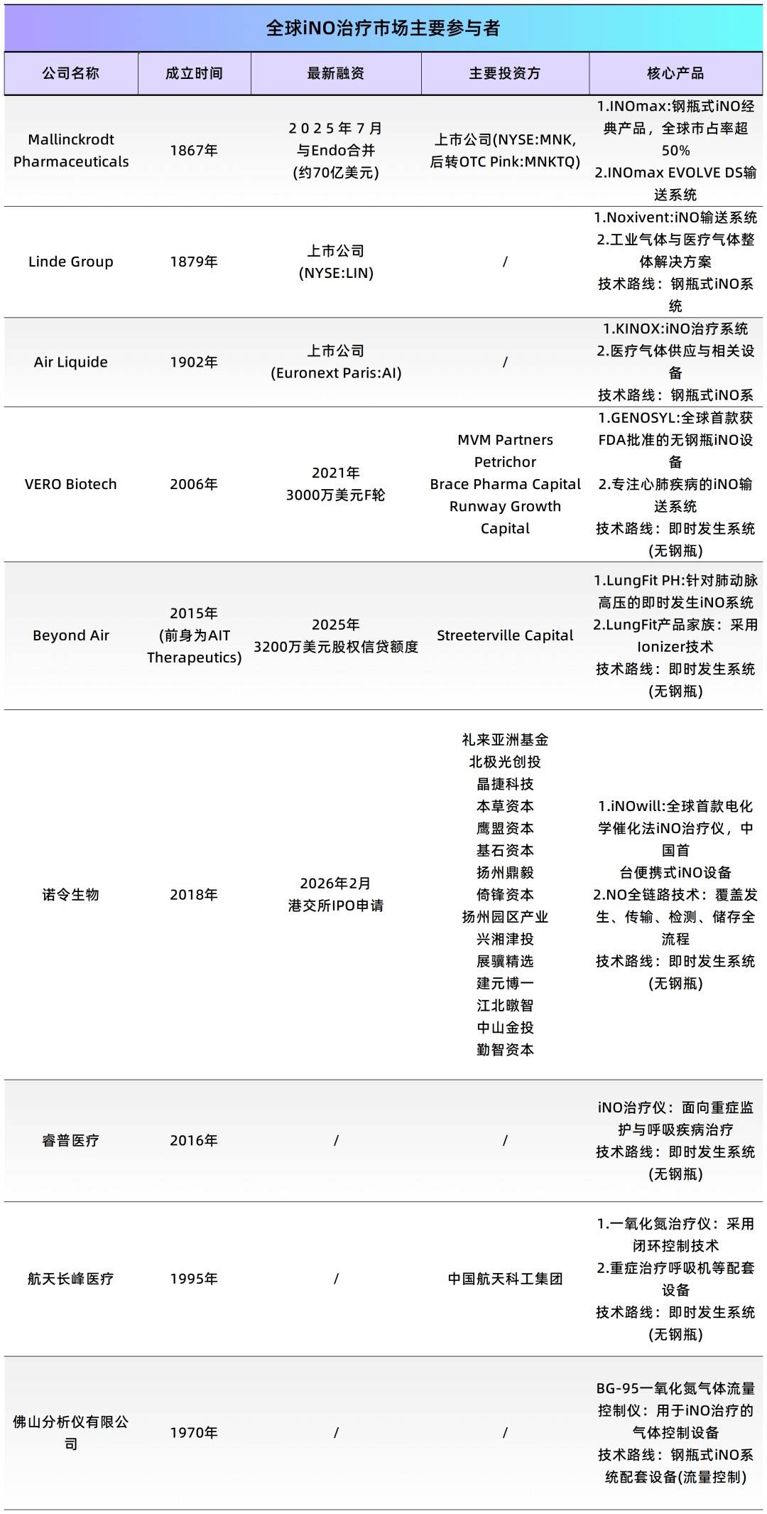 全球范围内,Mallinckrodt Pharmaceuticals的INOmax是钢瓶式iNO的经典产品,在全球市场占据超50%份额。Linde Group和Air Liquide等气体巨头也凭借Noxivent、KINOX等产品分食市场。