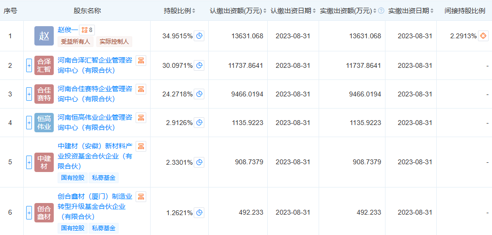 天眼查App显示,赵俊一是五星新材实际控制人,直接持股34.95%,间接持股2.29%;河南合泽汇智企业管理咨询中心(有限合伙)、河南合佳赛特企业管理咨询中心(有限合伙)、河南恒高伟业企业管理咨询中心(有限合伙)分别持股30.10%、24.27%、2.91%。