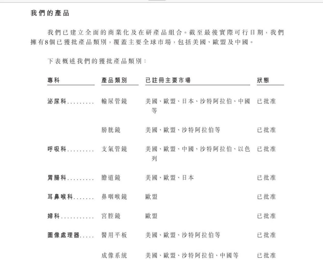 经过多年发展,明智科技已建立了用于一次性内窥镜系统的垂直整合制造平台,公司产品主要包括两大板块:一是一次性内窥镜,产品组合包括一次性输尿管镜、膀胱镜、鼻咽喉镜等。二是与内窥镜产品兼容的图像处理器。公司已在全球主要市场(包括美国、欧盟及中国)拥有8个已获批产品类别及5个在研产品类别。